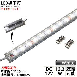 品番 TK-12V-1200-55K(裏面マグネット付)〔室内用〕。入力電圧 DC12V。消費電力 13.2W。寸法 D1125×W20×H14mm(両端連結線含まず)。重量 230g。光束 1320Lm...