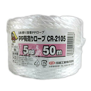 仕様品番:CR-2105色・柄:白規格:5mm×50m用途:重たい荷物、引っ越し時の荷物の結束に。材質:ポリプロピレン形状:3本より・溶着あり●ソフトで強度抜群のPPロープ。●ひもより強度が強く、結束後も長持ちします。切り口がバラつかず、