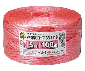仕様品番:CR-2110色・柄:赤規格:5mm×100m用途:重たい荷物、引っ越し時の荷物の結束に。材質:ポリプロピレン形状:3本より・溶着あり●ソフトで強度抜群のPPロープ。●ひもより強度が強く、結束後も長持ちします。切り口がバラつかず、