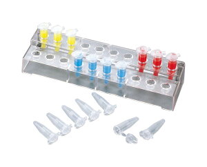 型番CR-2 商品説明●2段に段差が付けられており、使い易い構造です。 ●ベースの隅にすべり止め防止のゴムが付いています。 ●架数 1.5mL×20 ●大きさ 210×64×35mm ●材質 PC