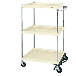 【商品説明】●ボルトレスで組立簡単。●棚板を逆さにするだけで、皿型・フラット型と組み替えることができます。●ゴム車を使用しているツールワゴンですので、表面硬度が低く、弾性を持っている為、凹凸のある路面でも容易に走行し