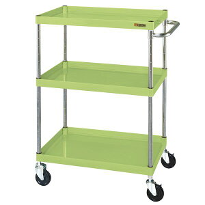 【商品説明】●ボルトレスで組立簡単。●棚板を逆さにするだけで、皿型・フラット型と組み替えることができます。●ゴム車を使用しているツールワゴンですので、表面硬度が低く、弾性を持っている為、凹凸のある路面でも容易に走行し
