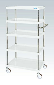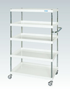 ●外寸:W900×D600×H1500mm●均等耐荷重:150kg●本体色:パールホワイト●質量:41kg●キャスター:75φナイロンウレタン車●段数:5●支柱:クロムメッキ25.4φ、棚板調整ピッチ50mm●改正RoHS10物質対応