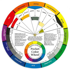 混色・色の組み合わせを考えるときに便利です。 表面はポケットカラーホイールになっています。 12種の基本色に、レッド、イエロー、ブルー、ホワイト、ブラックを混ぜた時の色が一目でわかります。 実際に絵具で色を作る前に、混色が