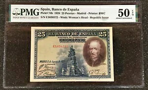 1928 Spain Banco De Espana 25 Pesetas Pick# P-74b PMG AU 50 EPQ商品について販売者メモ「UNC について」製造国/地域 スペインPMG認証国 スペイングレード50紙幣の種類...