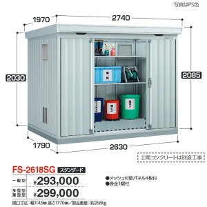 [商品名] イナバ物置 稲葉製作所 ゴミ保管庫 床パネルなし仕様 FS-2618SG スタンダード 豪雪型 [サイズ(mm)] 間口2630×奥行1790×高さ2085 開口寸法:幅1143×高さ1770 床面積:4.71平方メート