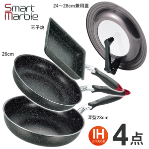 SmartMarble スマートマーブル 4点セットの解説 見た目も美しいマーブルコート・丈夫で長持ち・焦げ付きや汚れがつきにくい ・少量の油でヘルシーに調理できる ・調理中に置き場所に困らない。立てて置けるフライパンカバー ・熱くなったフ