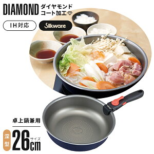 【卓上鍋兼用ダイヤコートフライパン 26cm 深型】ハンドルを外してそのまま食卓で卓上鍋としても使える!取り外し可能な脱着式ハンドルのフライパンです。微細粒子の人工ダイヤモンドをふっ素樹脂に配合した磨耗に強いコーティング...