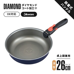 シリコーンゴム 生産国/中国製 ●取り外し可能な26cm深型フライパンです。 ●ハンドルを外してそのまま食卓で卓上鍋としても使えます。 ●微細粒子の人工ダイヤモンドをふっ素樹...