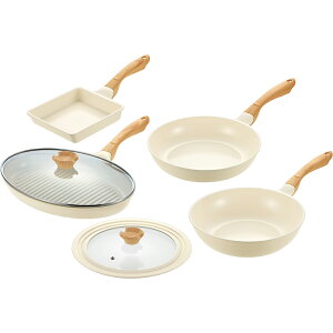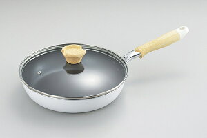 【特長】●耐久性抜群。角の丸い金属ヘラOK。●取り扱いやすい超軽量タイプ。●内面ビスなしで洗いやすく清潔です。●お料理が映えるおしゃれなアイボリーカラー。ハンドルはシックな木目調。●熱周りが良いので中火で十分に調理可能。