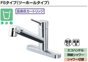 浄水器内蔵シングルレバー混合水栓 オールインワン浄水栓 FSタイプ(ツーホールタイプ) 機 能: ●エコハンドル ●微細シャワー ●シャワー切替 呼び径:13mm 水栓取付穴:Φ24±2(2個) 吐水口長さ:2
