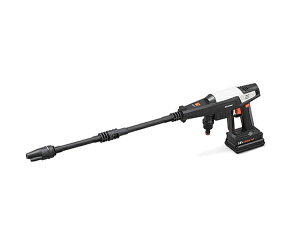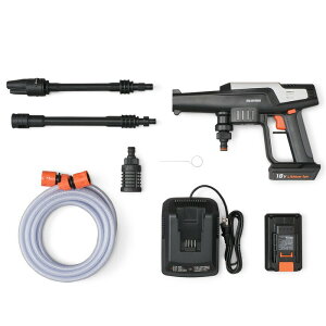 高圧洗浄機のガンと本体が一体化したハンディウォッシャー。充電池の取り付けだけで使用できるポータブルタイプ。据え置きの本体も電源コードも水タンクもいらないからいつでも、どこでも使える。マンションなどのベランダはもちろん