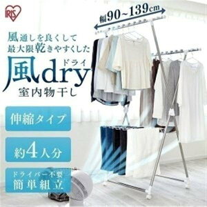 風の通りを考え、乾きやすさを追求した室内物干し。 高さ違いの2段構造で風が奥まで抜けやすく、後ろの洗濯物にもしっかり風が当たります。 扇風機やサーキュレーターを併用することで、乾燥時間が最短で半分に短縮されます。(※アイリスオーヤマ社...
