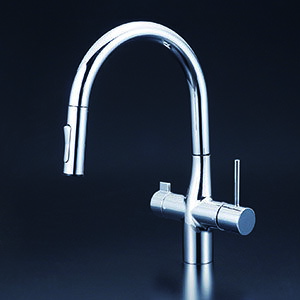 【メーカー】 ●(株)KVK 【特長】 ●タンブラー式切替構造:タンブラー式のボタン切替によりストレート吐水とシャワー吐水の切替が簡単にできます。 ●シャワーヘッド引出し:コンパクトなシャワーヘッドは引き出しができ、広いシン