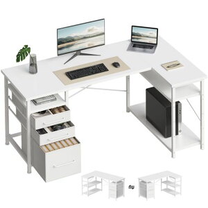 【引き出し3杯付きl字デスク・収納力満載】デスクの下には一体型の引き出しとラックが備え、本や書類などを使いたい時にサッと取り出せます。たっぷりの収納でデスク周りをスッキリ快適に!また、L字型のデザインで部屋のコーナーを最大