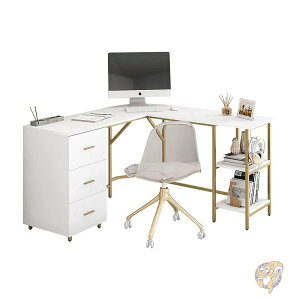 【引き出し付きデスク・収納力満載】デスクの足元には一体型の引き出しとラックが備え、本や書類などを使いたい時にサッと取り出せます。たっぷりの収納でデスク周りをスッキリ快適に!また、L字型のデザインで部屋のコーナーを最大限