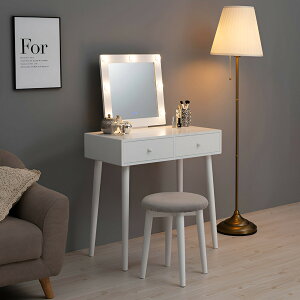 LEDの女優ライト付きのドレッサー。使う人を選ばないシンプルなデザインで、ベロア調クッションのスツール付。サイズ: ドレッサー:(約)幅75×奥行47×高さ123×天板高75.5cm、スツール:(約)...
