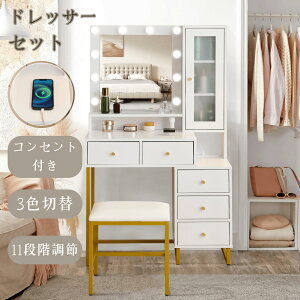 ドレッサー 化粧台 テーブル 鏡台 ライト付き 3色LED ドライヤーホルダー コンセント付き 女優ミラー 引き出し 収納 椅子 セット サイド収納 メイク台 シンプル 大容量 可愛い
