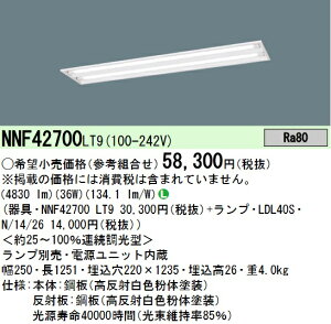 ●基本灯具:NNF42750 LT9 ●プラスユニット:FK42270F ●ランプ:LDL40S・N/14/26 ●ランプ別売、電源ユニット内蔵 ●幅:332mm ●長:1279mm ●埋込穴幅:300mm ●埋込穴長:1257mm ...