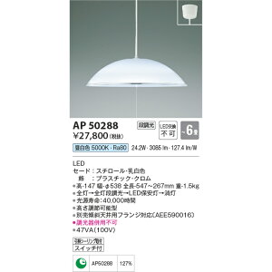 コイズミ照明 LED 居室用ペンダント 昼白色 KAP50288 〜6畳用 LED セード:スチロール・乳白色 飾:プラスチック・クロム ●高-147 幅-φ538 全長-547〜267mm 重-1.5kg...