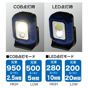 ●高輝度(散光)のCOBと長時間(スポット)のLEDの2種切替●USB出力給電機能付(5V 2A)●強力マグネットで鉄板等に固定可能、三脚に取り付け可能なM8ナット付、フック付●電池残量表示機能付【仕様】点灯モード:COB...