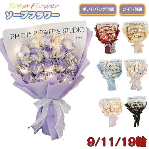 ソープフラワー 花束 手提げ袋付き カーネーション バラ LEDライト付き LED イルミネーションライト ブーケ フレグランスソープフラワー 枯れない花 花 造花 石鹸花 プレゼント ギフト 誕生日...