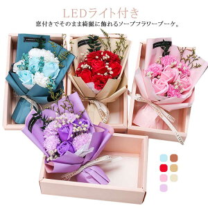 光るLEDライト付き、大きめサイズ感のソープフラワーの花束。母の日や敬老の日はもちろん、結婚祝いや、出産、誕生などの記念日にも大活躍のソープフラワー。存在感抜群のLEDライト付き。ソープフラワーに絡めてより美しくより華やかに
