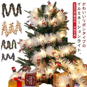 かわいいリボンタイプのイルミネーションライト。5M50球(電池式・点滅可能)優しい電球色が魅力で、クリスマスツリーを彩るイルミネーションとしてはもちろん、壁面や窓の周りに飾っても素敵です。ひも状タイプなので形を自由自在にアレ