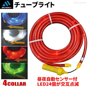 この商品のポイント 長さ10mの乾電池式チューブライトです。 ●昼夜自動センサー付で暗くなると自動で点滅します。 ●LED24個が12個ずつ交互に点滅します。 ●防滴タイプ ●LEDカラーは赤・青・緑・白の4カラー...