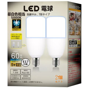 サイズ:60W形-2個入◆商品名:LED電球 E17口金 T形タイプ電球 60~75W形相当 1190lm 電球色 電球型蛍光灯EFD25・EFD15形代替推奨 全方向タイプ 密閉器具対応 断熱材施工器具対応...
