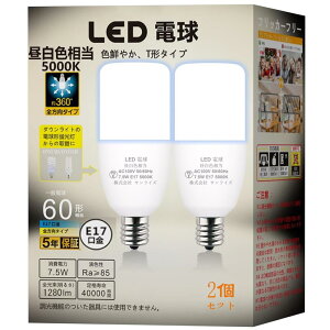 サイズ:60W形-2個入◆商品名:LED電球 T形 E17口金 60W形相当 (7.5W) 1280lm T形タイプ電球 全方向タイプ 電球型蛍光灯 昼白色 EFD25・EFD15形代替推奨 密閉器具対応...