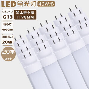LED蛍光灯 40W形(グロー式工事不要) 消費電力 20W 定格光束 4000lm 色温度 電球色3000K/白色4000K/昼白色5000K/昼光色6000K 口金 G13 照射角度 180° 点灯方式...