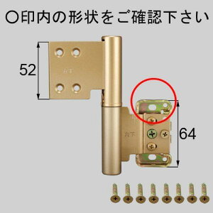 部品名 : 室内窓用丁番(上)左 商品コード : MDTG43BL (品番変更 MDTG43FL ) 色 : サテンゴールド 内容物 : 本体(MDTG43BF)×1、取付ネジセット(予備2本)×1 備考 : 刻印:左上 戸襖ドア
