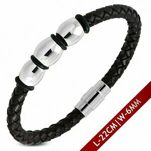 bracelet en cuir noir tresse et fermeture magnetique 22 cm x 6 mmブラックレザーストラップ