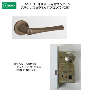 ミワロック LA51-3 ステンレスセラミックブロンズ(CB) レバーとケース錠のセット販売です。 外側なし/内側サムターンの片面サムターン錠です。 材質:レバーハンドル ステンレス製 バックセット:51mm...