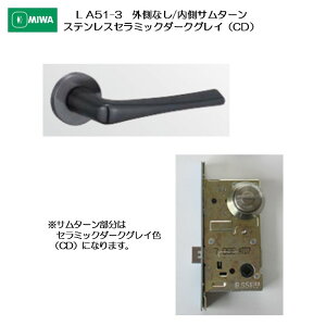 ミワロック LA51-3 ステンレスセラミックダークグレイ(CD) レバーとケース錠のセット販売です。 外側なし/内側サムターンの片面サムターン錠です。 材質:レバーハンドル ステンレス製 バックセット:51mm...