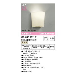 【仕様】●メーカー:オーデリック/ODELIC●型番:OB080932LR●JANコード:4905090910900●ブラケットライト●高感度人感センサー付き●白熱灯器具60W相当●電球色●2700K【ご注意】※寿命は...