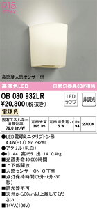 【仕様】●メーカー:オーデリック●型番:OB080932LR●商品名:LEDブラケットライト●重量(kg):0.4●高感度人感センサーON/OFF型●R15 クラス2●高演色LED●上下部開放タイプ●LEDランプ型...