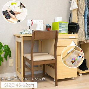 商品詳細 折り畳みテーブル・ミシン台 商品サイズ(約)cm 幅92(畳んだ状態は46cm)×奥行53×高さ73cm 引出し内寸:引き出し内寸 幅31×奥行33×深さ7cm (深さ有効寸法9cm) 材質 (本体)プリント紙化粧繊維板...
