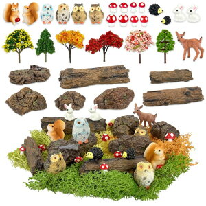 ミニチュアガーデンデコレーション:人工木の切り株3個、ミニチュアフェイクストーンロック4個、苔パック4個(各10g)、木6本、フクロウ4羽、ウサギ2匹、ハリネズミ2匹、キノコ8個、鹿1頭が含まれており、妖精の庭、盆栽、鉢植え、卓上デ