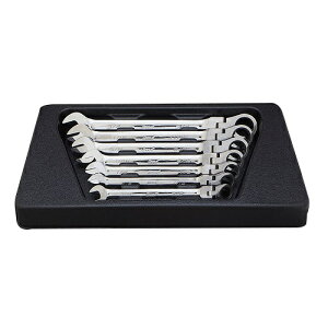 メガネ部オフセット角(°):75材質:クロームバナジウム鋼ミラー仕上げのメッキが美しい75°オフセットメガネレンチセット。手前の障害物を越えて作業する場面で威力を発揮。トレイ付き。コンパクトなデザインで、狭い場所での作業に最適