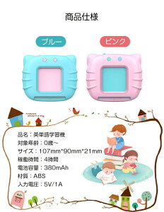 商品仕様製品名:英単語学習機カラー:ブルー、ピンク対象年齢:0歳〜サイズ:107mm*90mm*21mm稼働時間:約4時間電池容量:380mAh材質:ABS入力電圧:5V/1A注意事項モバイルバッテリーが内蔵する単電池1個あたりの体積...
