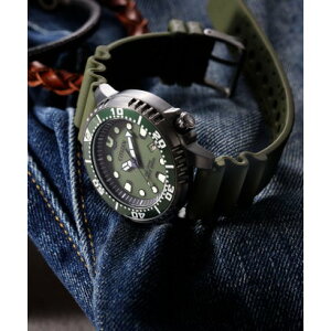 ケース全体をマットなグレーで仕上げた塊感のあるデザイン。深いカーキ色の文字板とグリーンのアルミリングも相まって、ひときわ力強い印象を与えます。カジュアルなテイストを演出しながらも、ダイバーズウオッチに求められる視認性