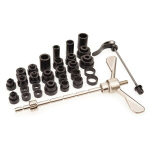 ■ハブに使用されるカートリッジベアリング(ラジアルベアリング)の圧入用工具。■内径8〜20mm の21サイズのベアリングに対応するアルミ製アタッチメントが付属し、それぞれに確実な作業を可能にするセンター軸が施されている仕様です