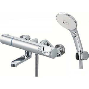 設定温度に自動で調整されるサーモスタット式シャワーバス水栓の洗い場専用短尺吐水口タイプ ・大判のシャワーヘッドと空気を含んだ大粒の水滴で浴び心地の良さを向上、さらに節湯性能も両立させたエコアクアシャワータイプ。吐水、止