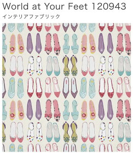 どの靴を履いて出かけようかとワクワクするような可愛らしいデザイン。キラキラとしたプリントが華やかなお部屋を演出します。英国製の海外取り寄せ生地です。 ハーレクインHARLEQUIN WORLD at your feet 綿100% 生...