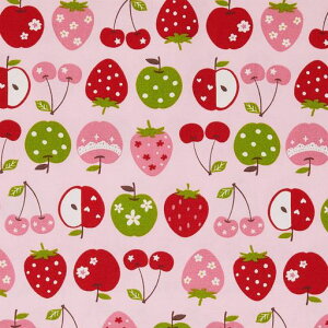 女の子におすすめの水を弾きやすい撥水加工を施したオックス生地1mカットです。子供用通園バッグや巾着袋などの入園グッズ作り・入学準備、エコバッグやアウトドア用品制作にもおすすめです。りんご・いちご・さくらんぼのフルーツが