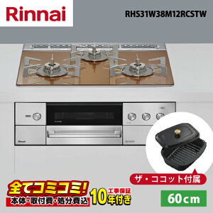 リンナイ RHS31W38M12RCSTW ザ・ココット付属 デリシア ガラストップ天板 スパークリングカッパー ステンごとく 60cm オーブン接続有 3V乾電池 レンジフード連動タイプ