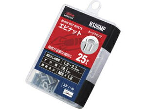 【特長】エビナットはナットとリベットの機能を兼ね備えたブラインドファスナーです。タップ立ての難しい薄材やパイプ・溶接のできないプラスチック板にも片側から簡単に取り付けることができます。専用のエビ印ナッターを使用すれば