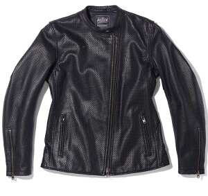 ■商品概要■レディース■カラー:ブラック■素材表:パンチングカウ(牛革) ※パンチ径2mm裏:ポリエステルメッシュ■詳細説明ファスナーおよびドットボタンには刻印が入ったKADOYAオリジナル品を採用。上前はドットボタンでラペルを折り